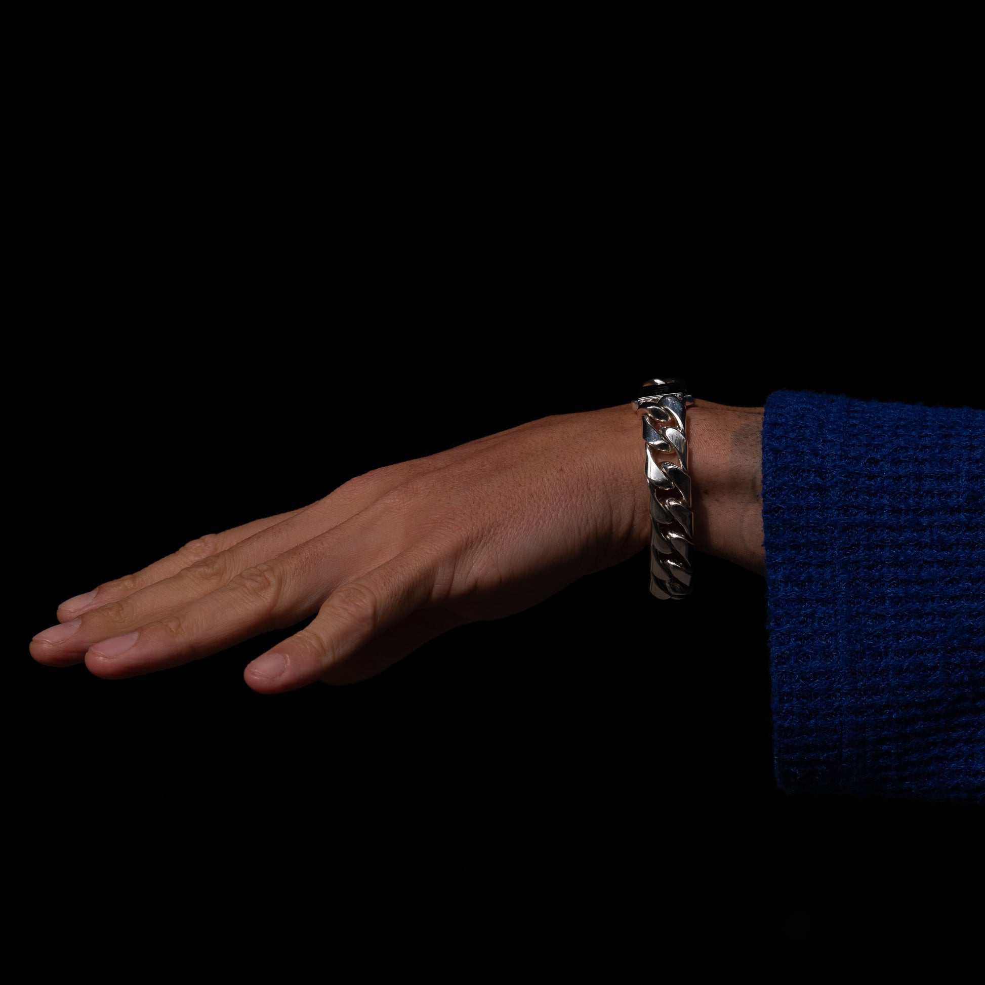 The RAWNINETY 14mm Cuban Bracelet is a bold expression of craftsmanship and modern design. Handcrafted from solid recycled 925 sterling silver, each meticulously polished link creates a seamless balance of strength and refinement. The substantial 14mm width delivers presence, while its heirloom-quality construction ensures longevity. Finished with a delicate RAWNINETY logo engraving, this oversized chain contrasts bold form with subtle detail—designed to stand the test of time.
