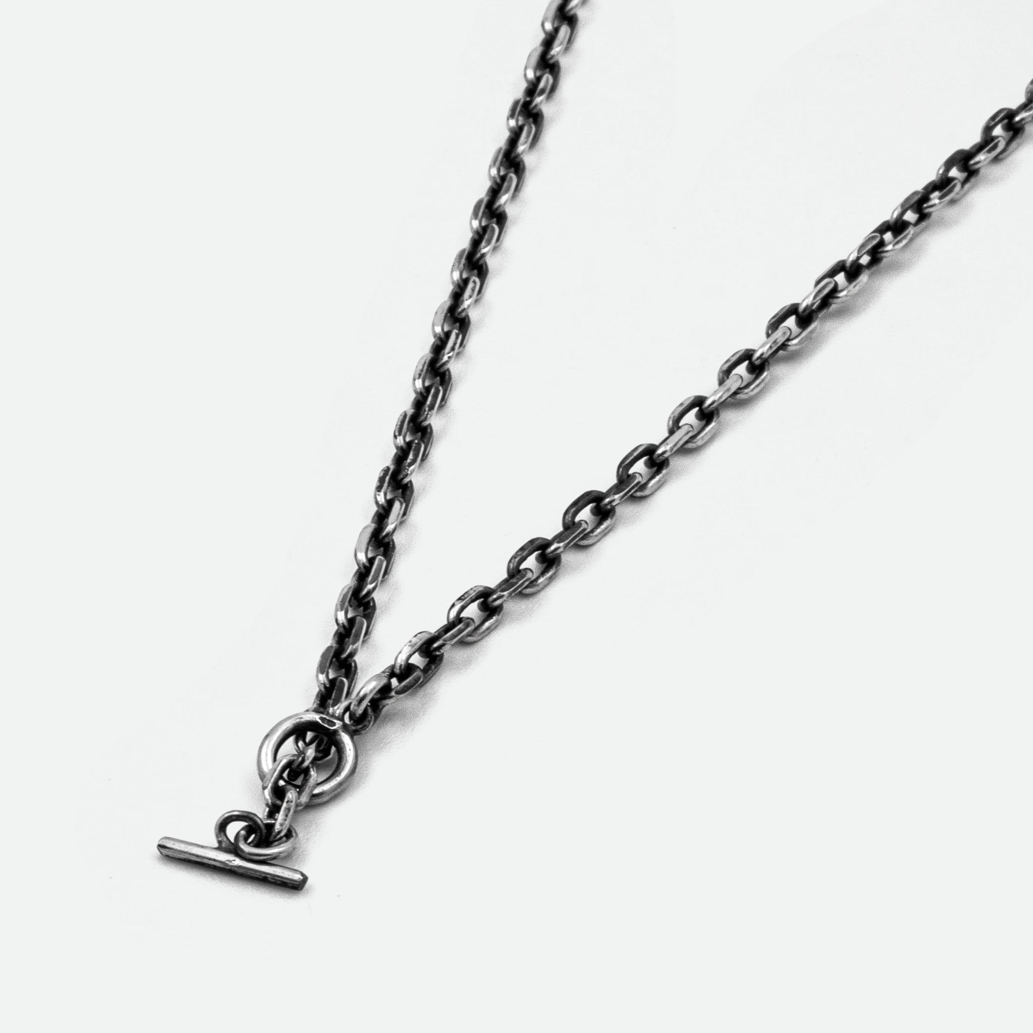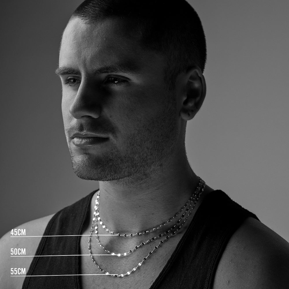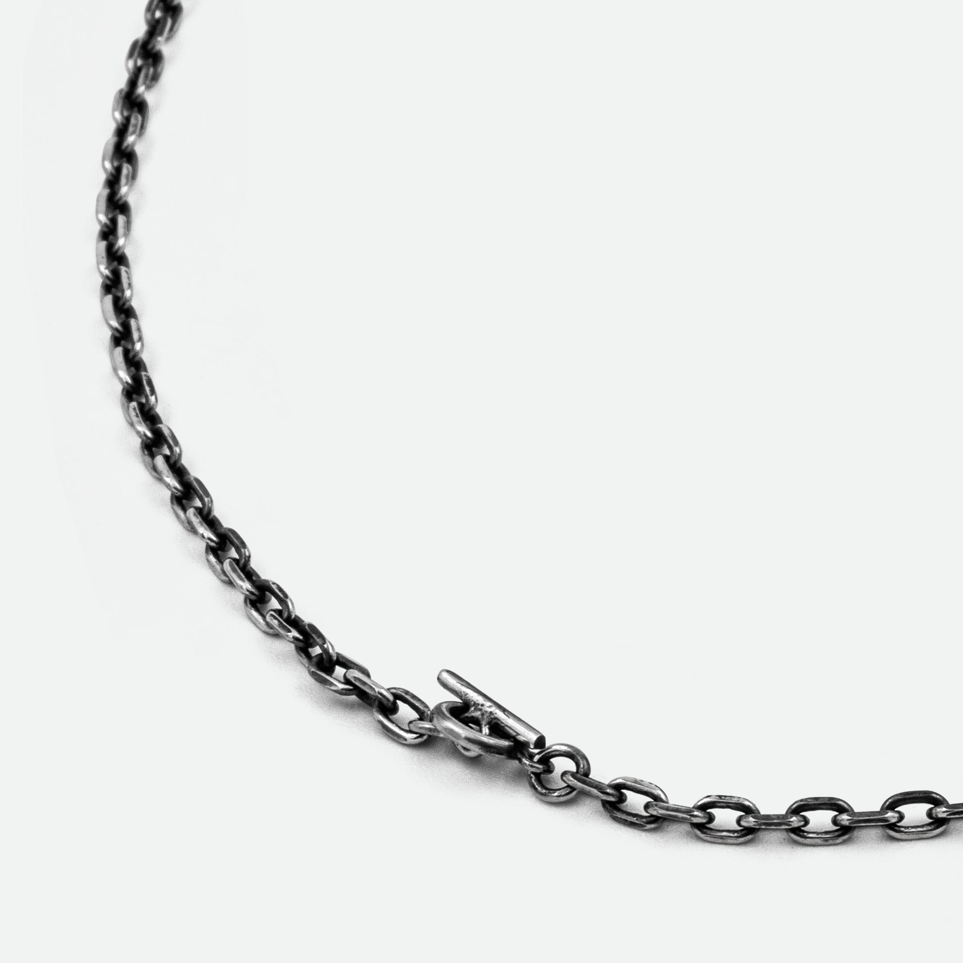 With more than first meets the eye, the Dimitri Chain features a distinct oxidised finish, balancing light with dark for an iridescent shine. At 50cm, the Dimitri adds length and texture to any layered chain set. Crafted from our signature 925 sterling silver, the T Bar closure can be worn at the front as a feature or fastened at the back.