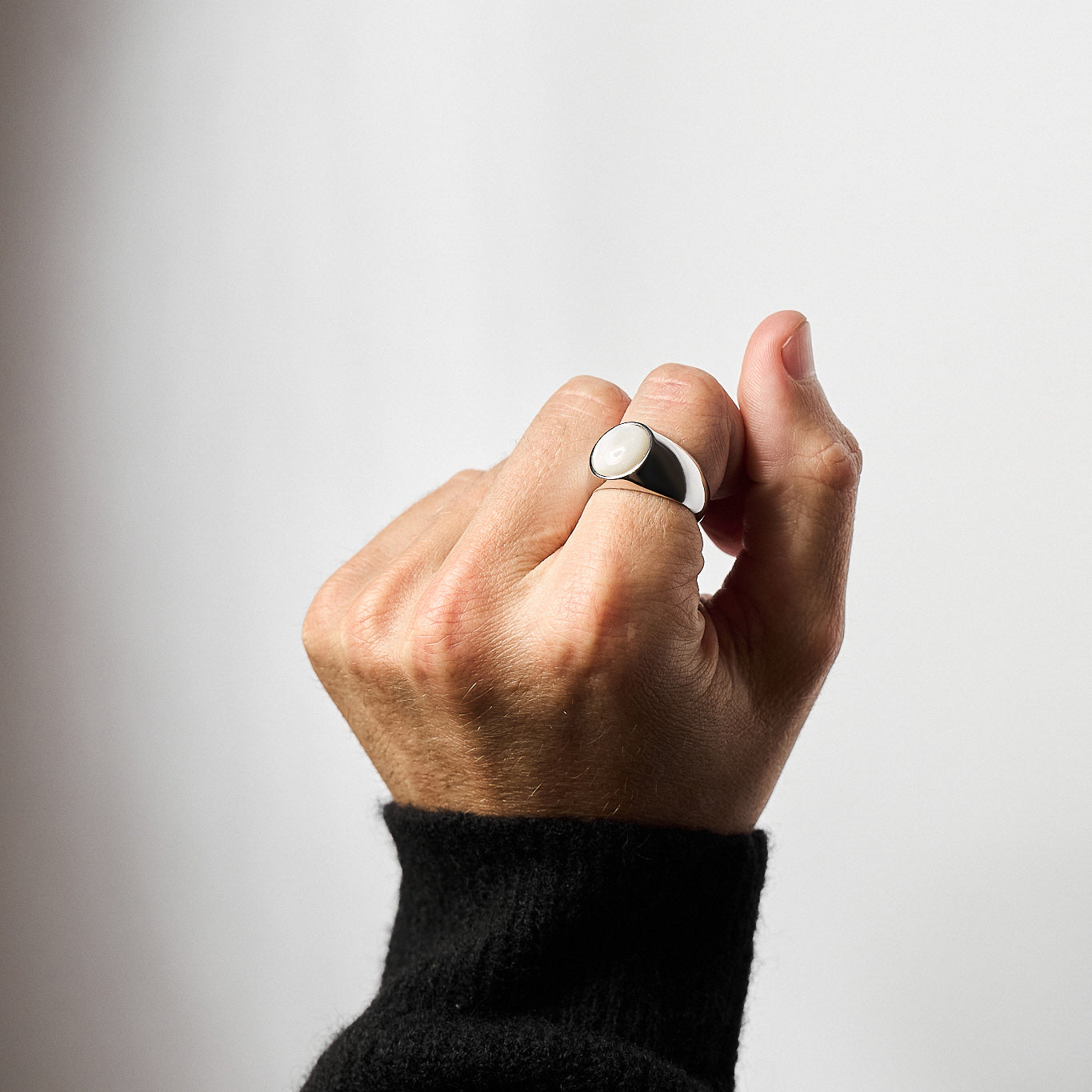 The M.O.P. Signet Ring merges refined craftsmanship with timeless design. Featuring a circular-cut cabochon mother-of-pearl centrepiece, it is crafted from rare, iridescent mineral compounds that are harvested, polished, and perfected to highlight its natural beauty. Set in recycled 925 sterling silver with a high-polish rhodium finish, this ring radiates protection and guidance. A distinctive staple for any wardrobe, the M.O.P. Signet Ring is designed to stand out with its unique and versatile appeal.