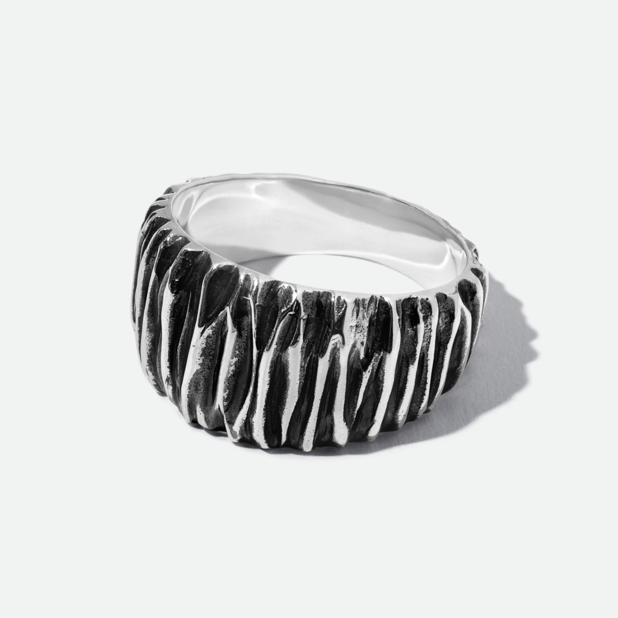 With signature oxidisation and polished edging, the Otis Ring has the visual appeal of a wide set band with a refined, smaller finish under the finger for comfortable all day wear. This unique design allows for wear on its own with the Otis Cuff, or with contrasting R90 band widths for a stacked effect.