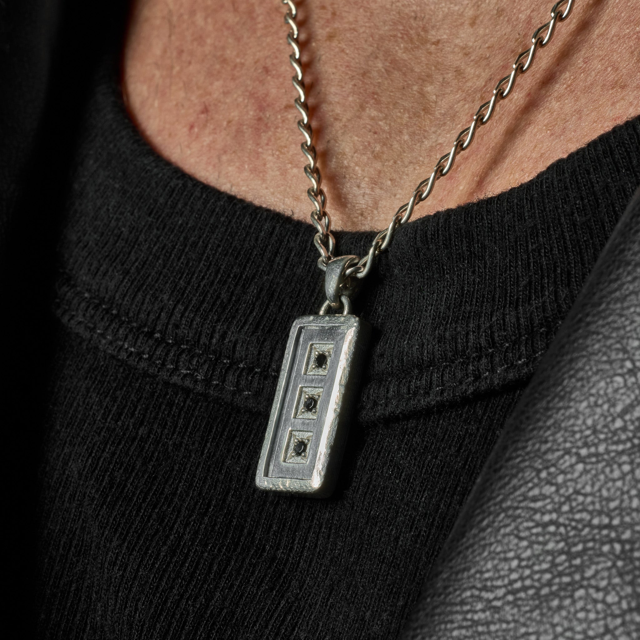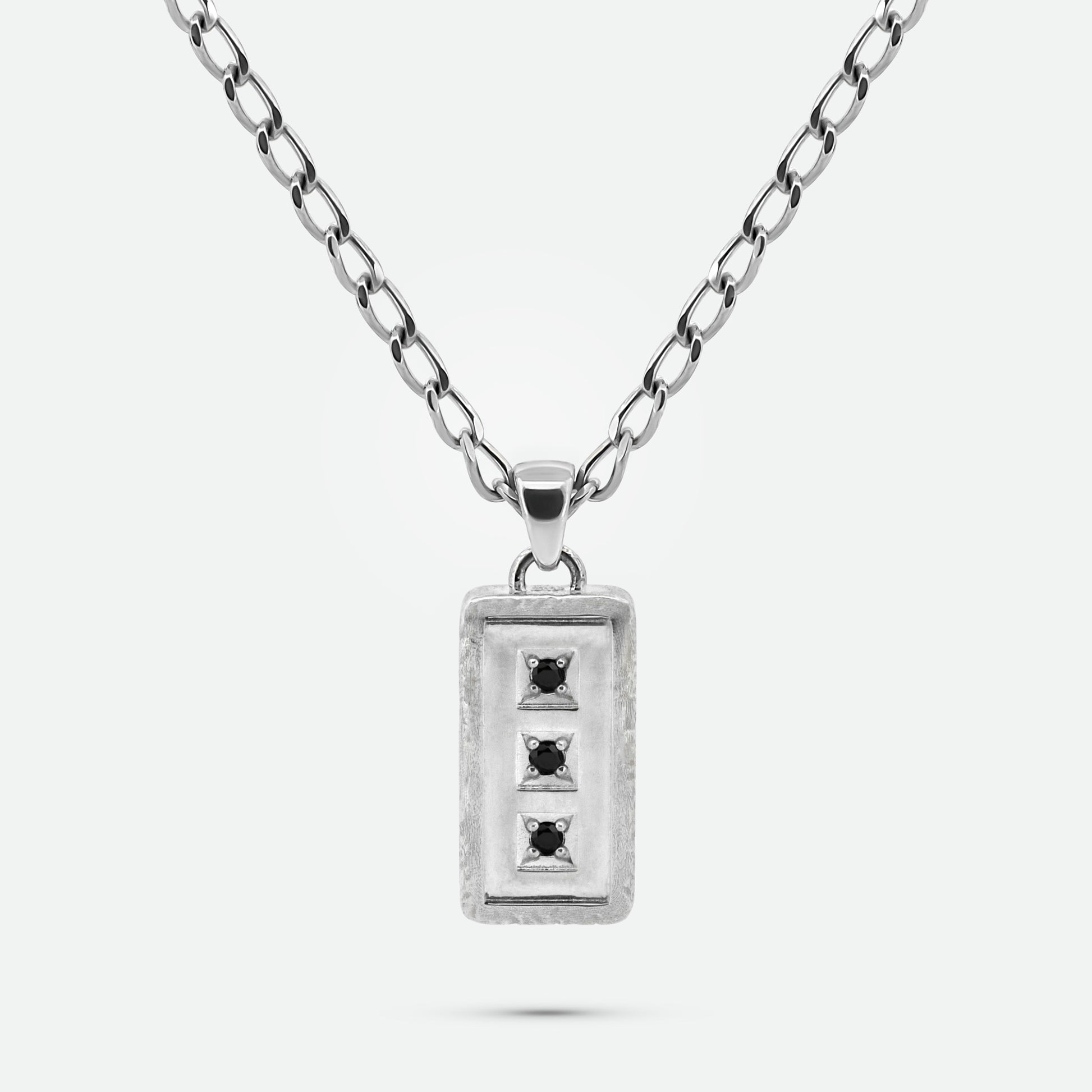 The Trilogy Pendant Necklace is crafted from recycled 925 sterling silver and features a solid rectangular pendant set with three bezel-cut Black Diamond Cubic Zirconias. Clean cut-outs frame each stone, creating a structured, refined profile finished in high-polished silver.
