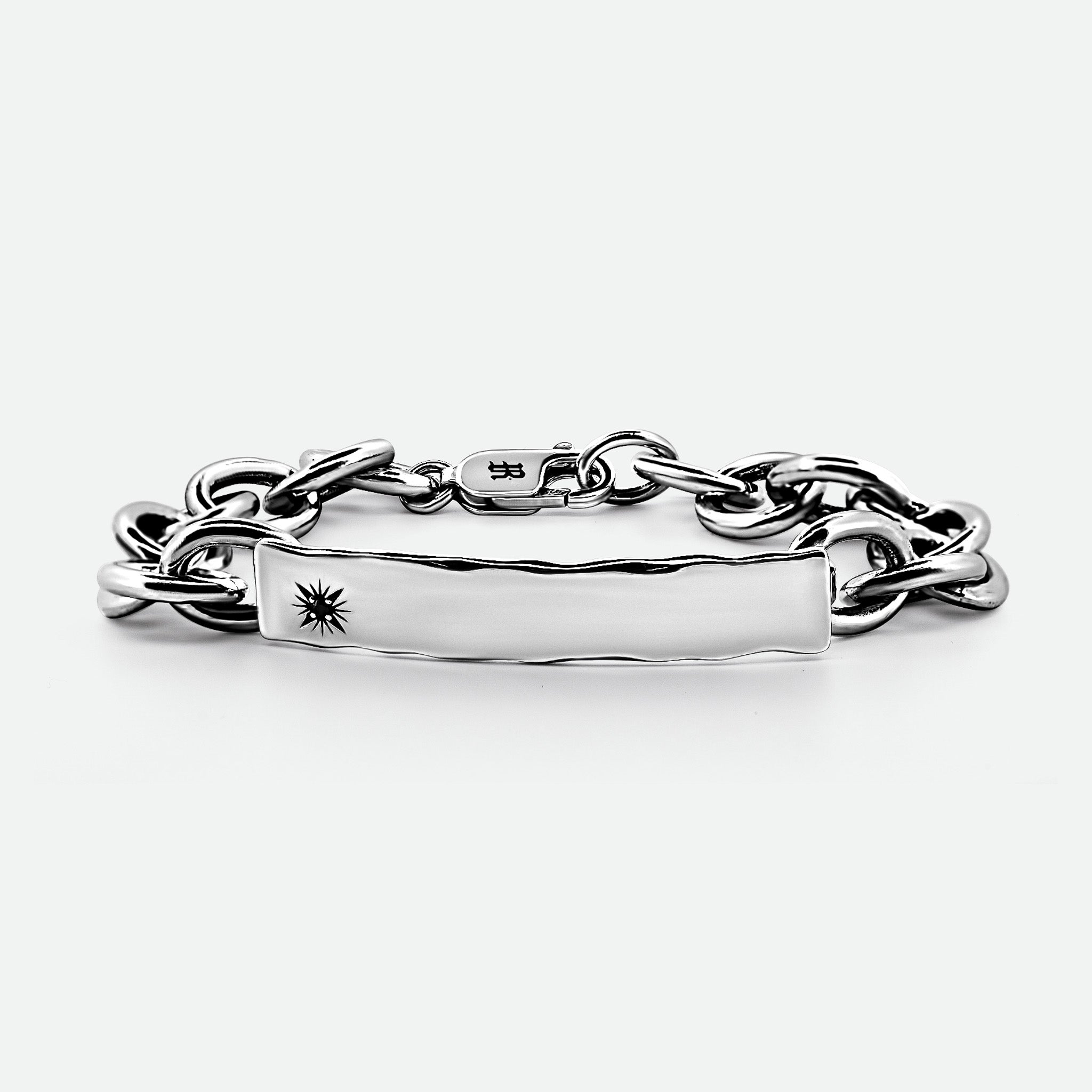 At its centre, a hand-sketched star engraving holds a black diamond cubic zirconia, symbolising strength and individuality. The Virgil Bracelet Chain is available in two core sizes – Medium (19.5 cm), and large (21.5 cm).