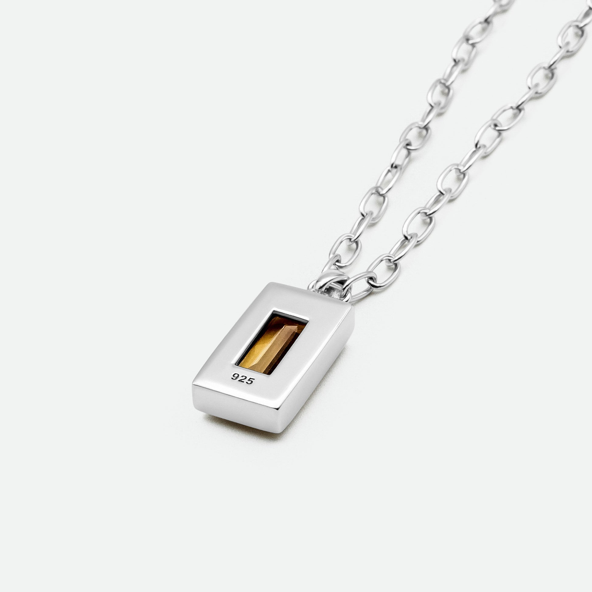 The Sona Citrine Pendant Necklace features a natural baguette-cut citrine with vibrant golden tones, framed in a high-polish rhodium-plated setting. Crafted from recycled 925 sterling silver, it comes with a durable 55cm sterling silver chain. Subtly engraved with the Rawninety logo for a refined touch, this pendant adds vibrant style to any look.