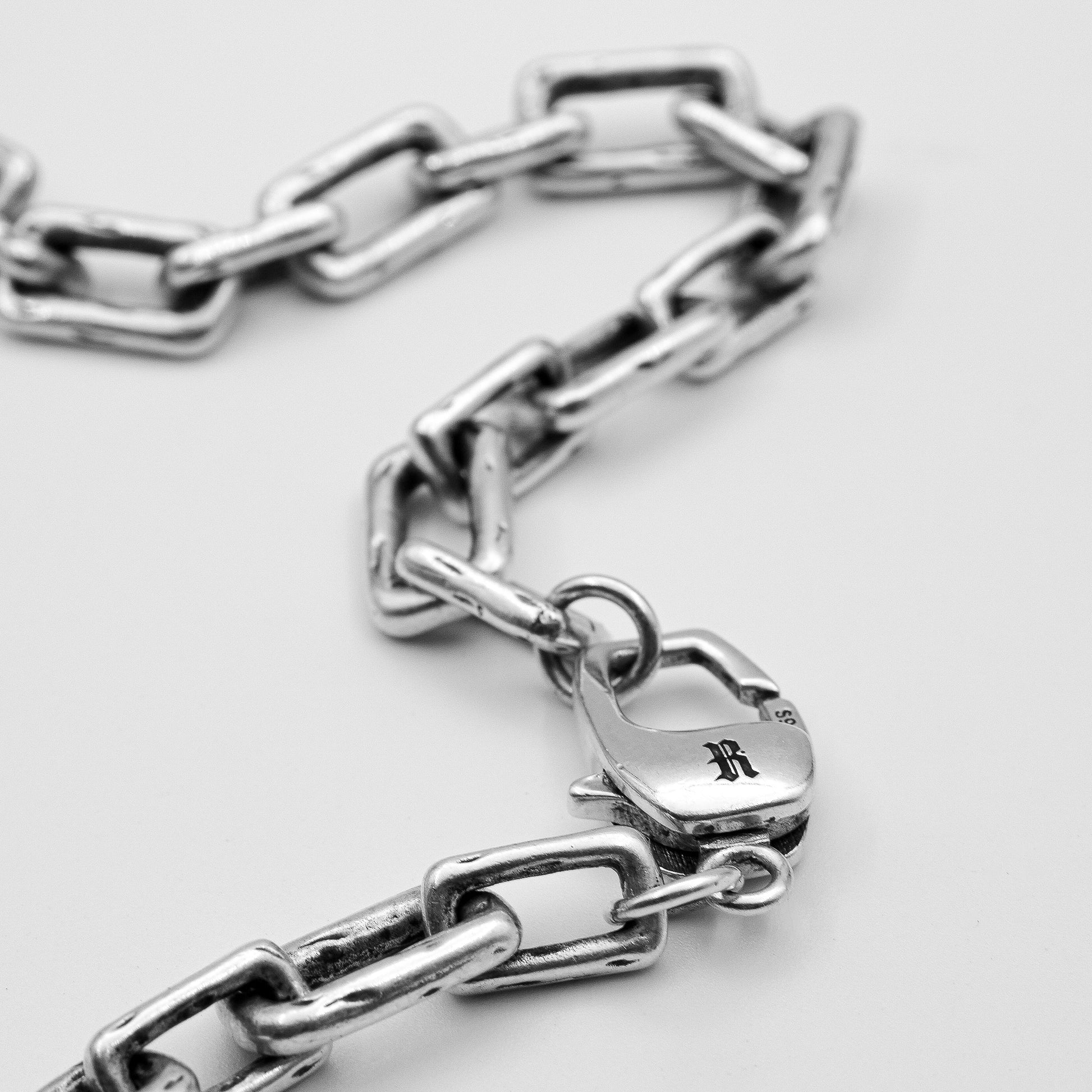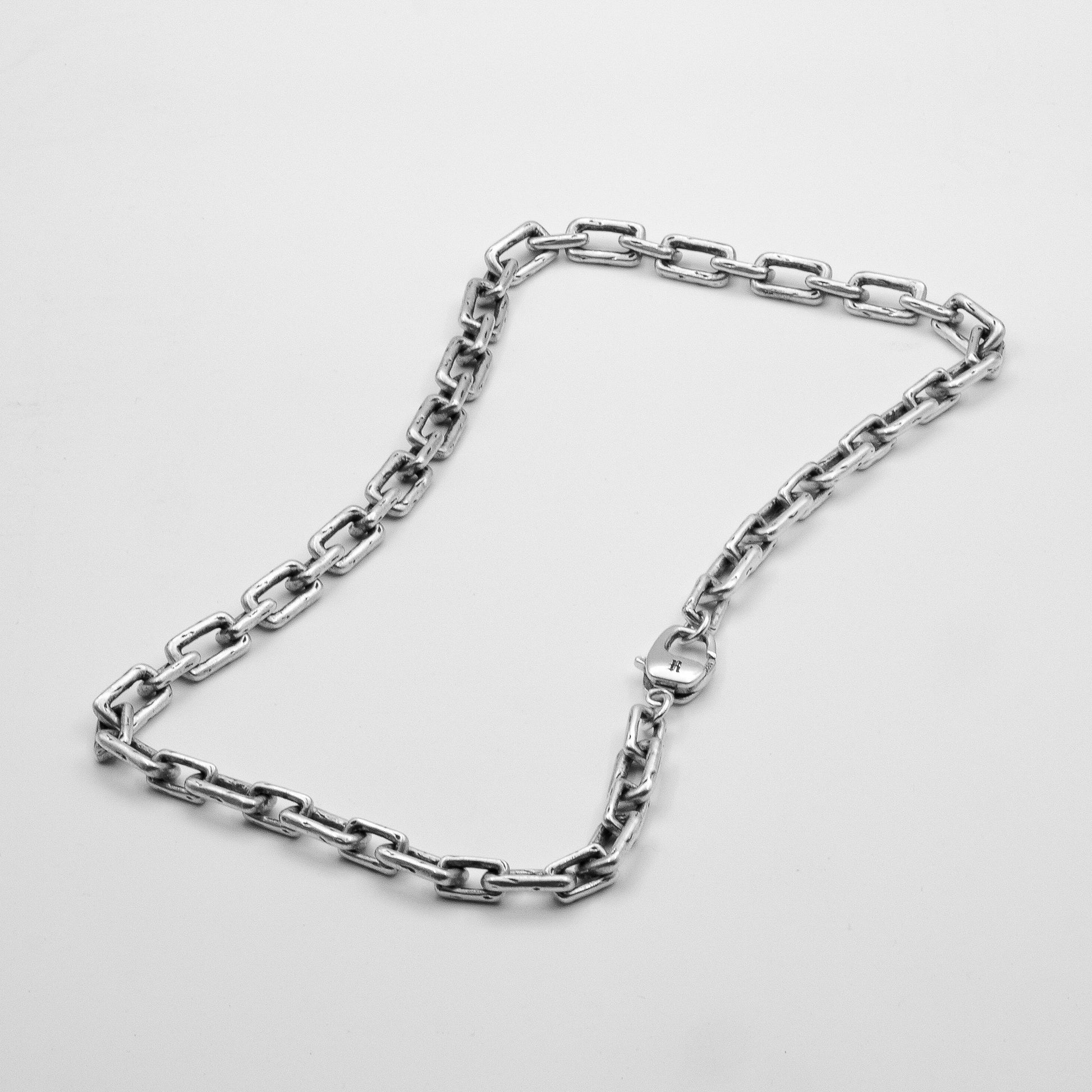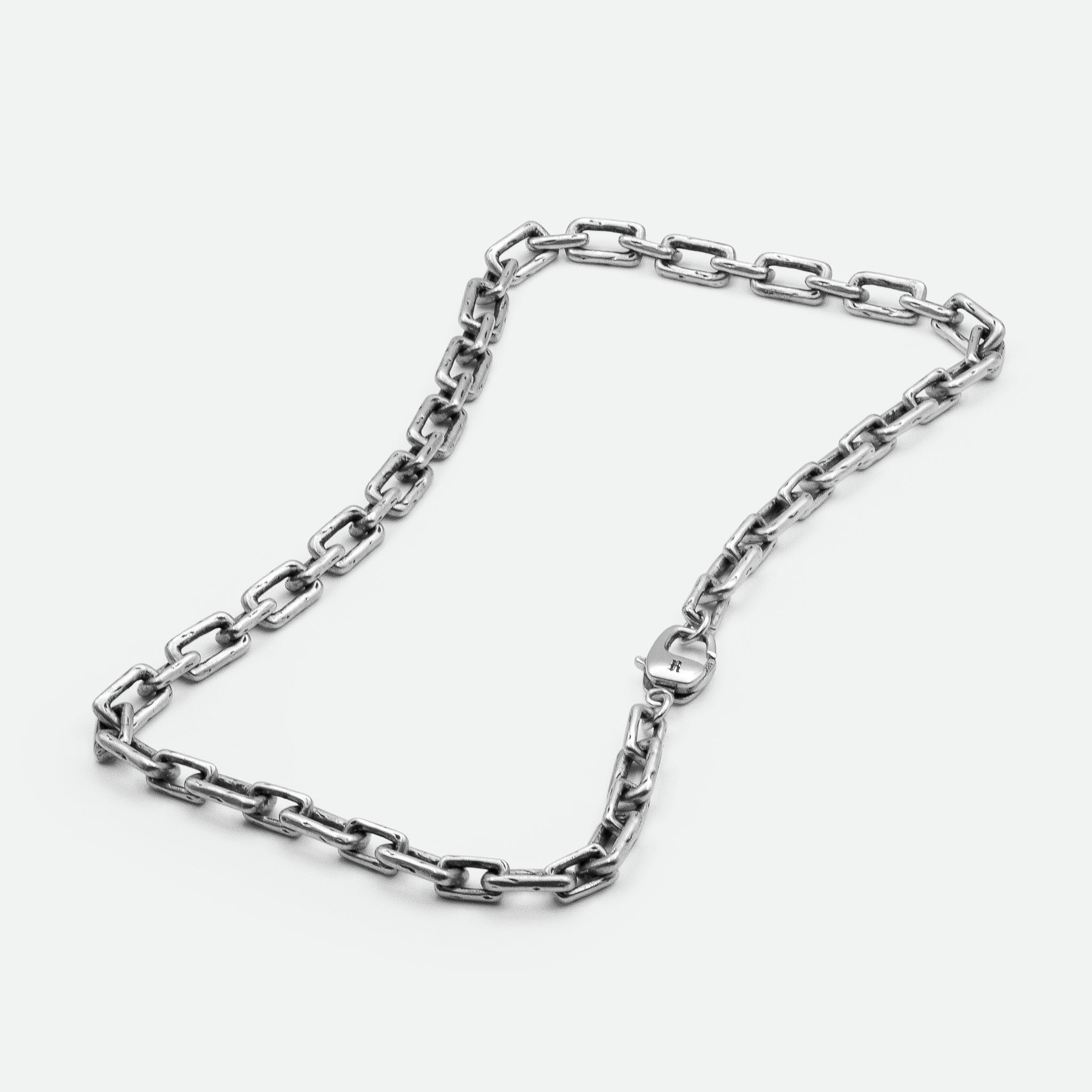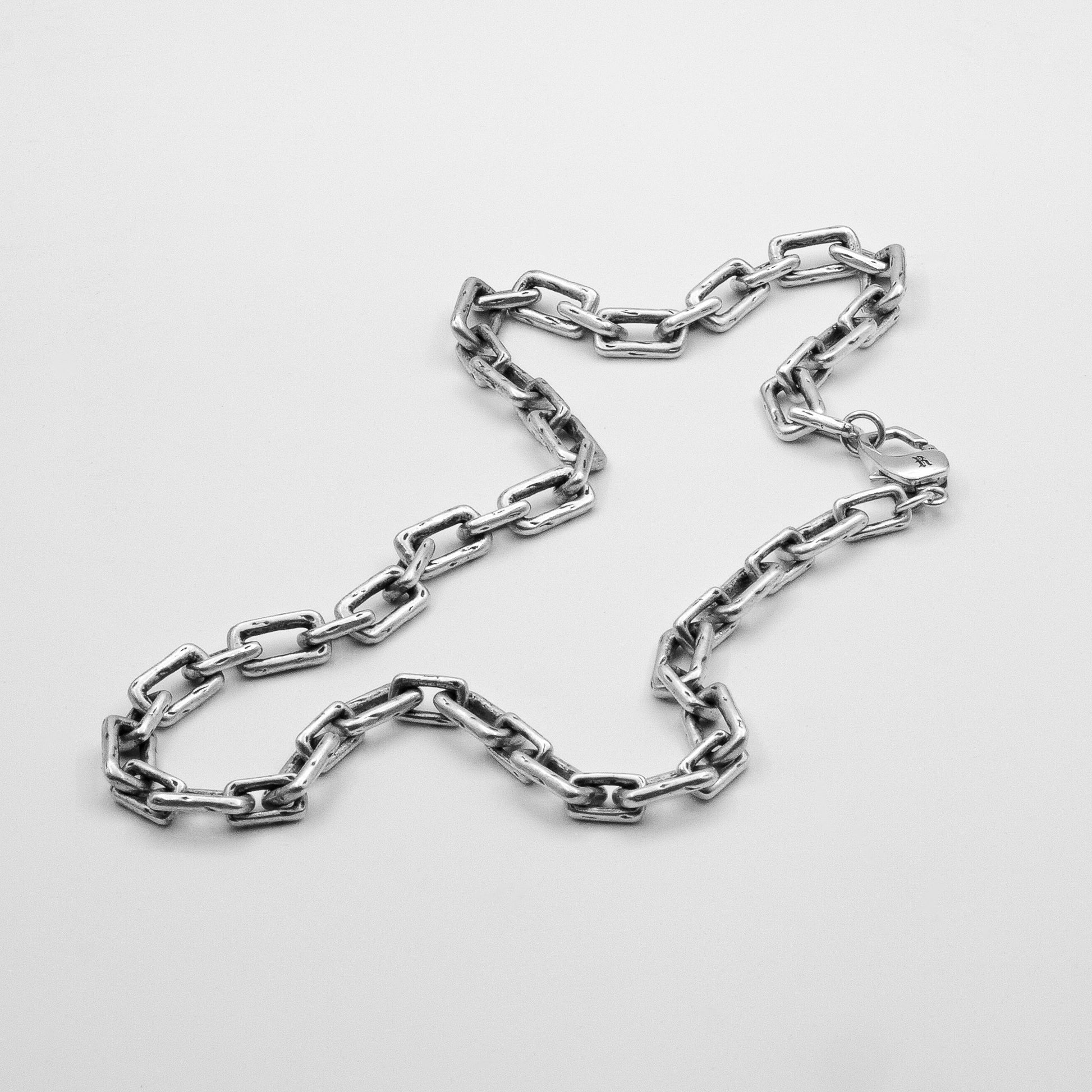 Complete your look with the Curtis Necklace, a vintage-inspired 925 sterling silver chain necklace designed with hand-etched detailing for a lived-in feel. Featuring varied chain links, this bold statement piece is handcrafted from recycled sterling silver and finished with a mix of oxidised and high-polished textures, enhancing depth and contrast.