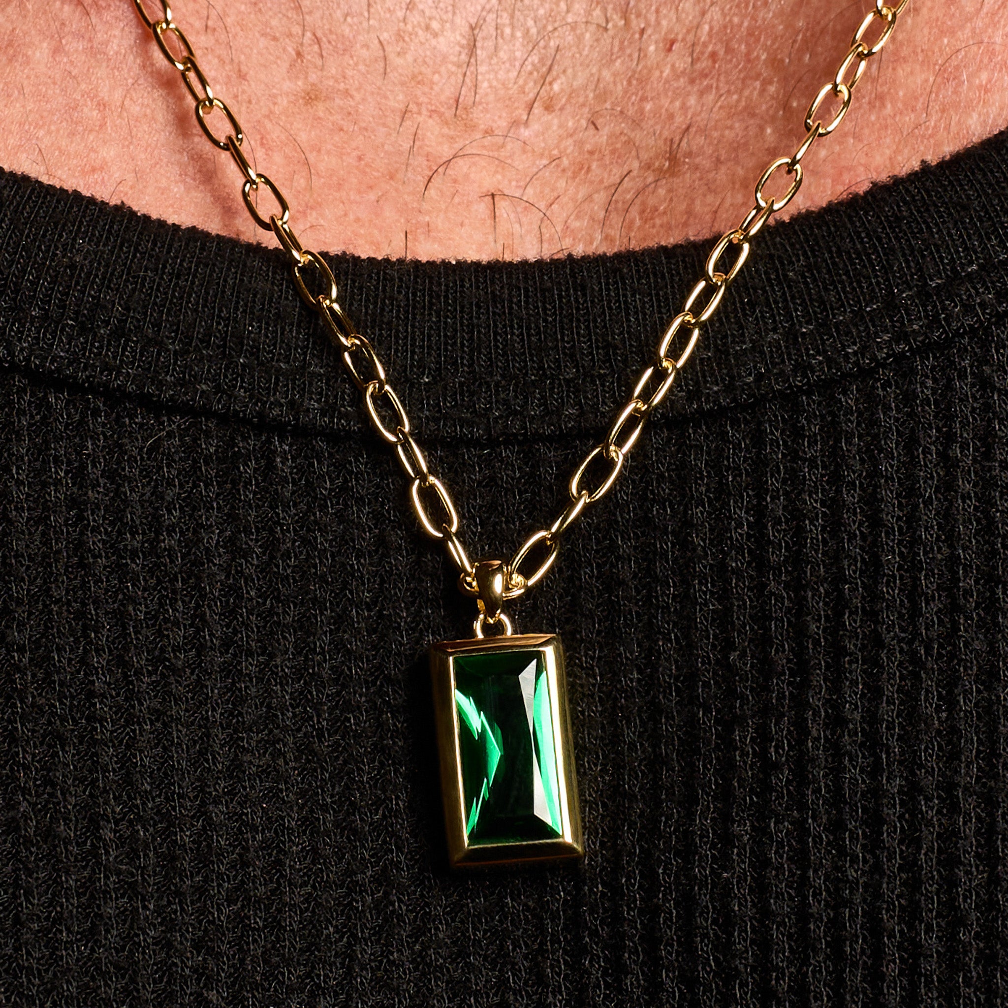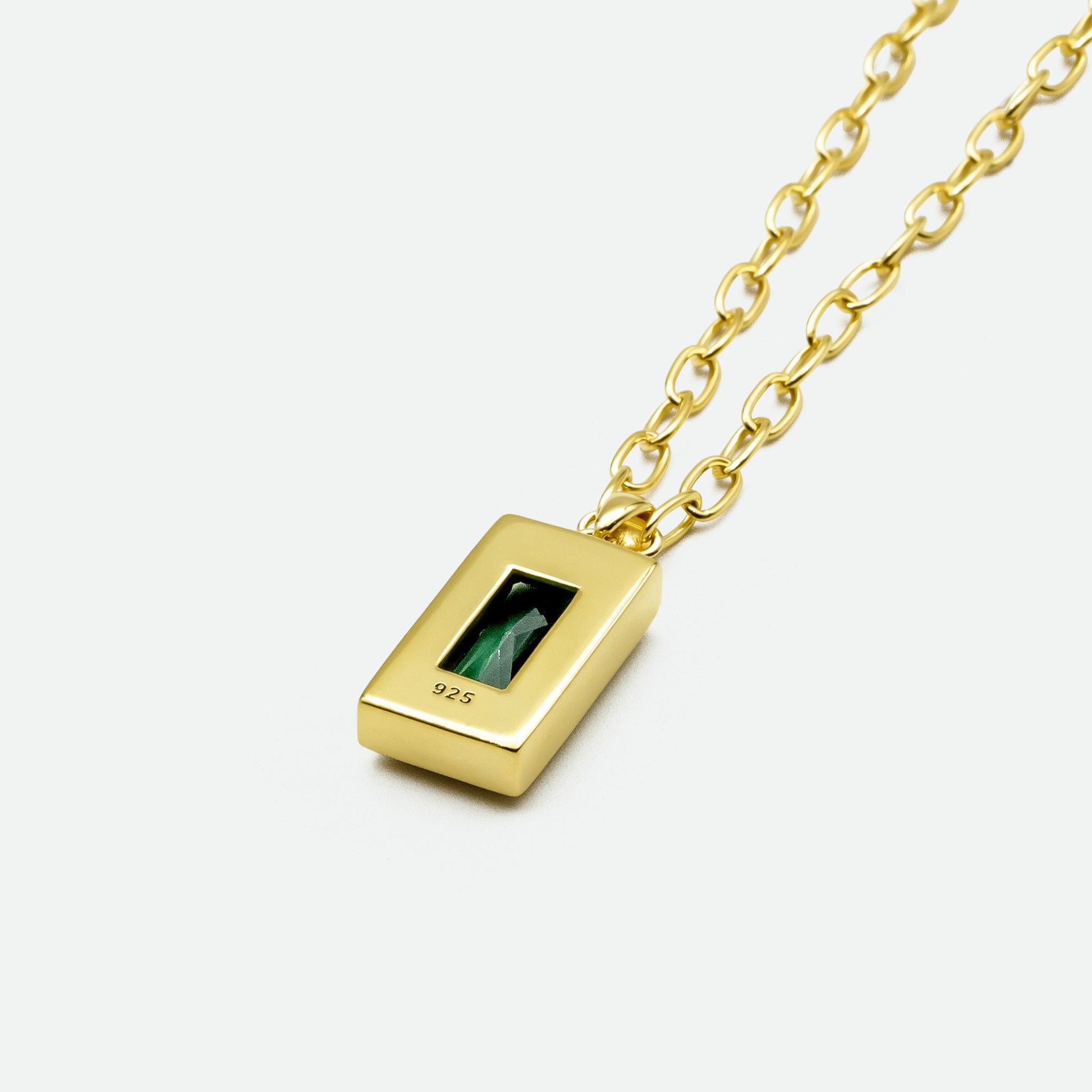 The Sona Emerald Gold Pendant reimagines a timeless design with a refined finish. Featuring a green emerald glass stone in a baguette cut, the pendant is set in 18K gold vermeil, plated with 3.5 microns of gold over recycled 925 sterling silver. Paired with a 55cm gold-plated chain, this gold necklace brings vibrant color and style to any look. Pair it with the matching Sona Emerald Gold Ring for a complete, coordinated set.