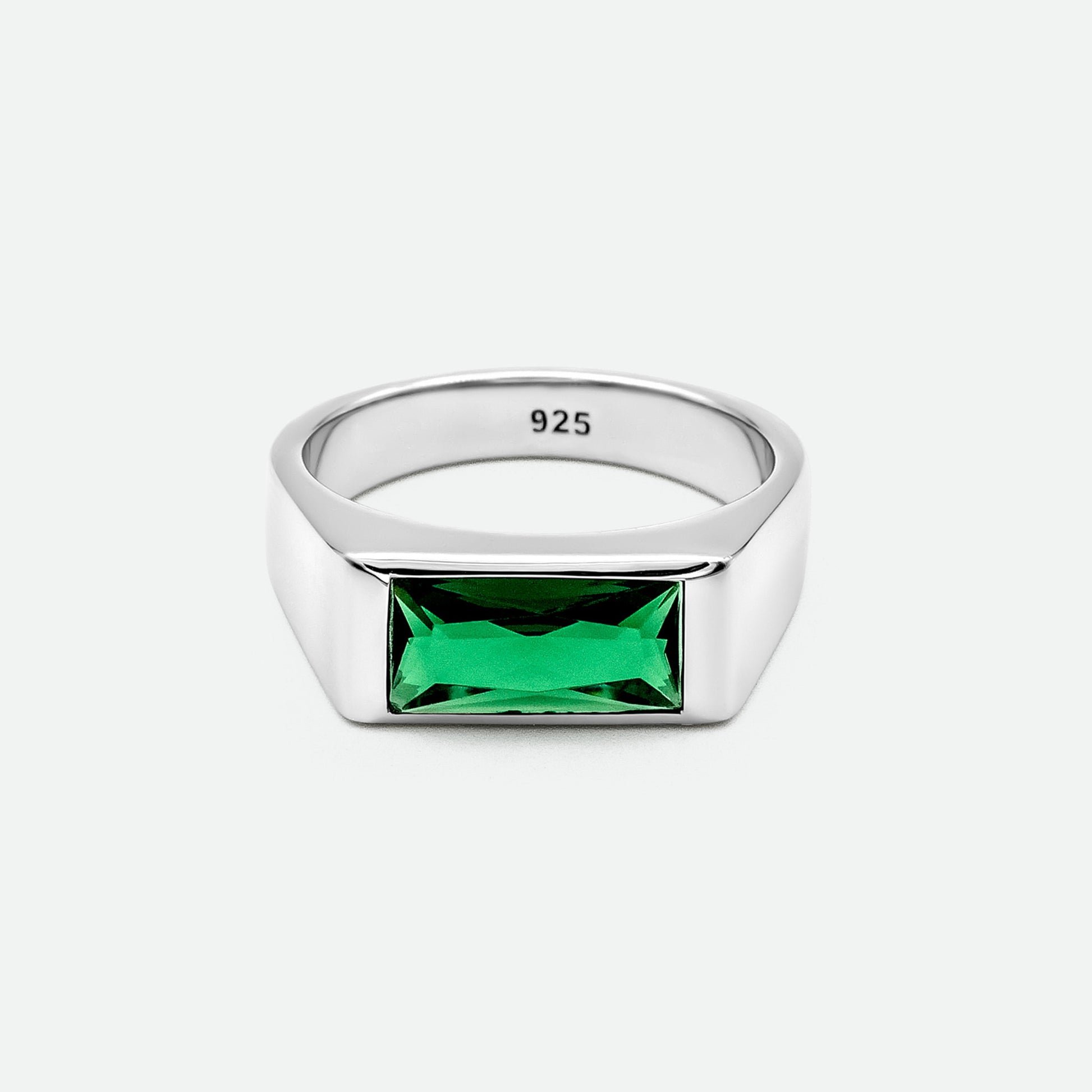 The Sona Emerald Signet Ring brings bold color to a clean, modern design. Featuring a green emerald glass stone in a baguette cut, the stone’s vibrant tones are framed in high-polish rhodium-plated recycled 925 sterling silver. Bold yet understated, this signet ring is perfect as a standout piece or paired with the matching Emerald Silver Pendant.