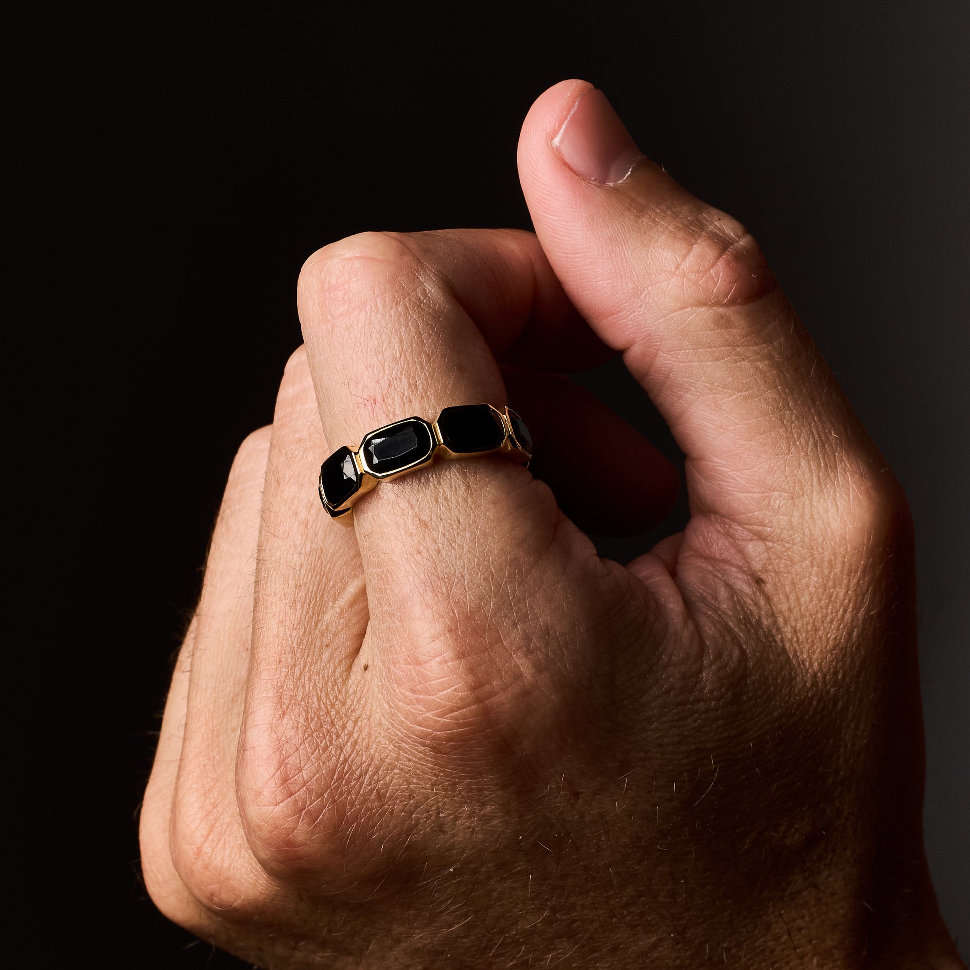 The Haven Gold ring elevates a bold design with its 18K 3.5-micron gold plating over recycled 925 sterling silver. Featuring eight Onyx stones, each precision cut and set within geometric tabs, this ring is a striking blend of craftsmanship and detail. The high-polish gold finish enhances the depth of the stones, making it perfect for layering or wearing as a standout piece. With its defined design and hand-finished touches, the Haven Ring in Gold is a versatile addition to any collection.
