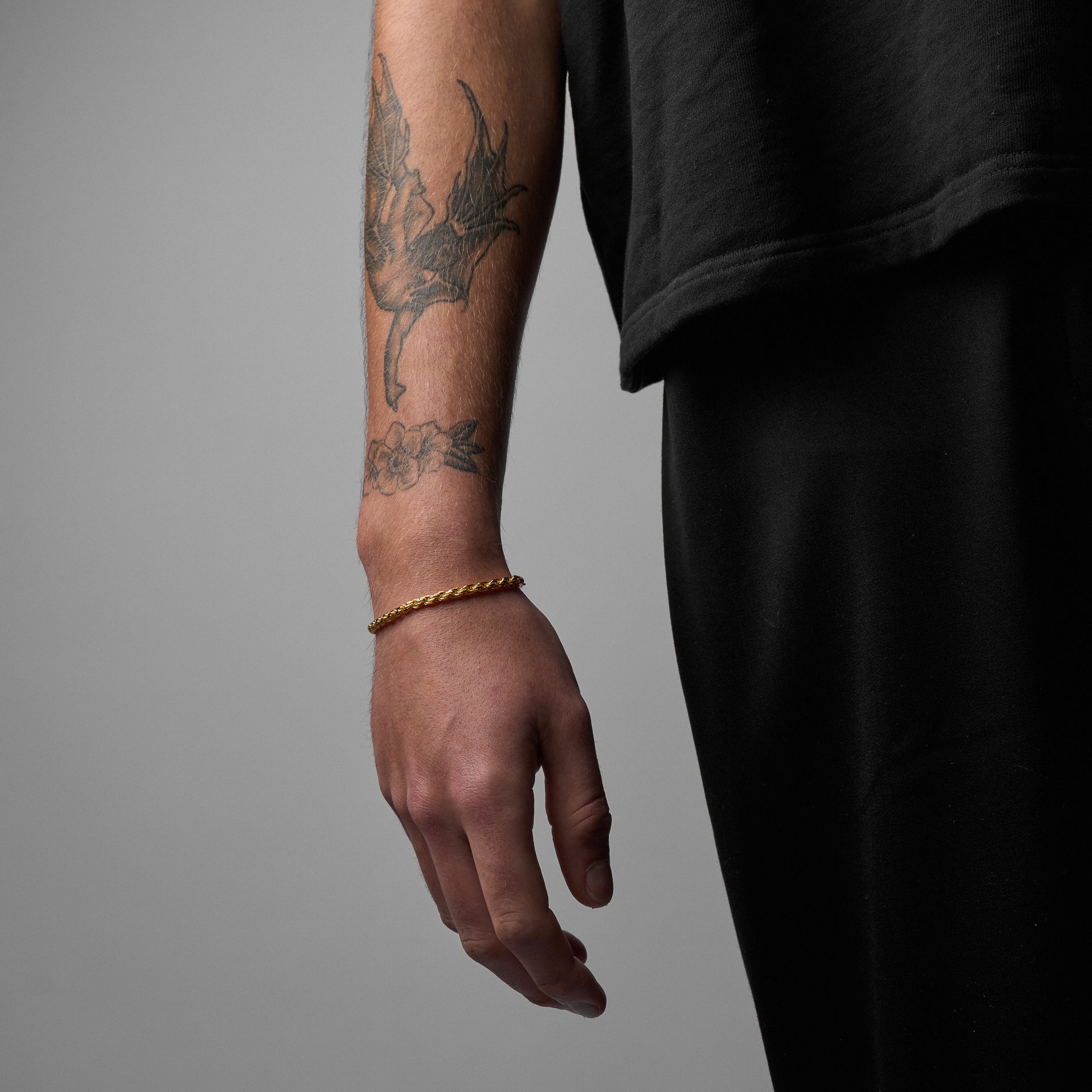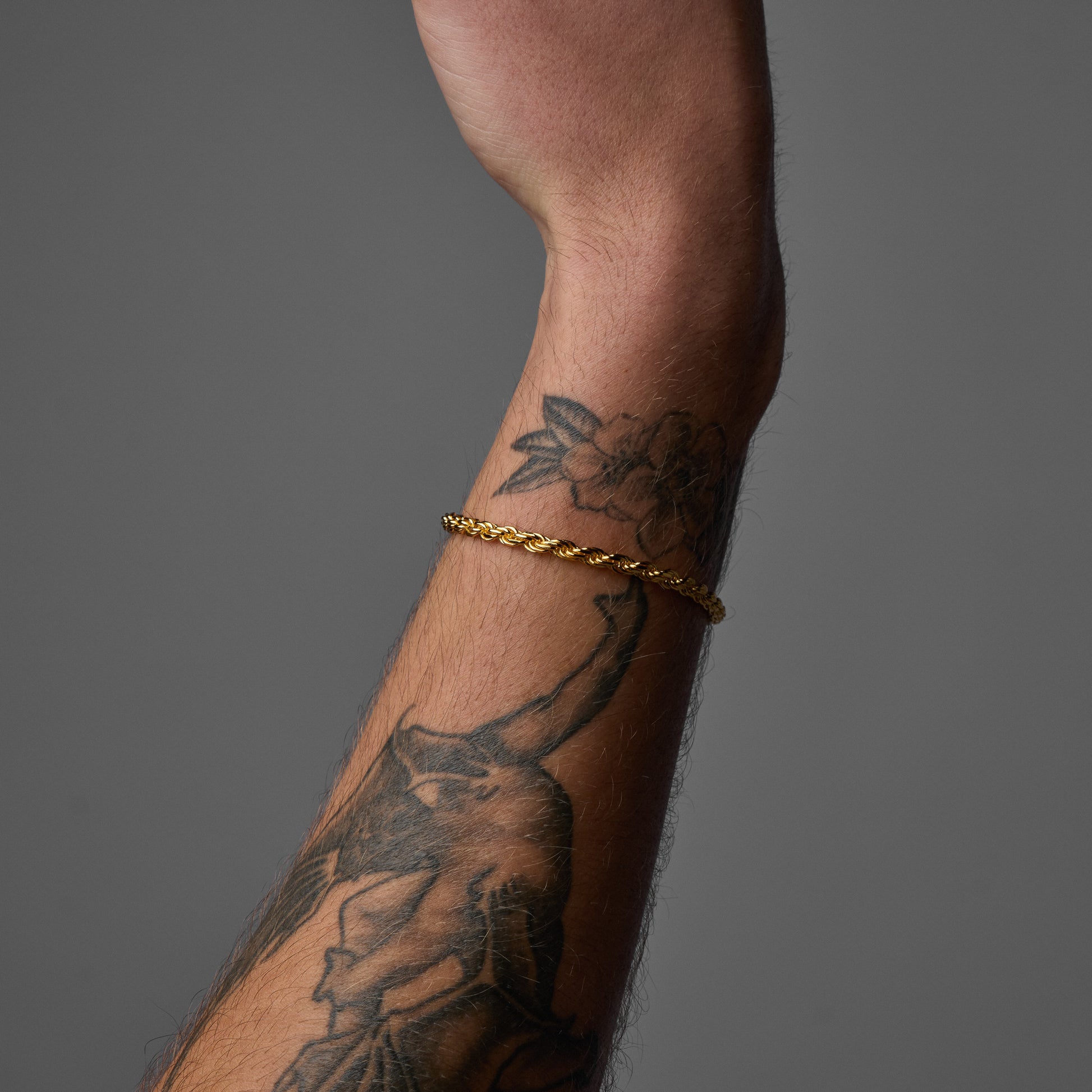 The Iris Chain Bracelet in Gold is a 4mm rope-style chain crafted from recycled 925 sterling silver, plated with 3.5 microns of 18K gold vermeil. With its intricate twist design, this bracelet adds a refined touch to any outfit while remaining lightweight and durable for everyday wear. Whether styled solo or layered, the Iris Chain is a versatile piece that effortlessly elevates your style.