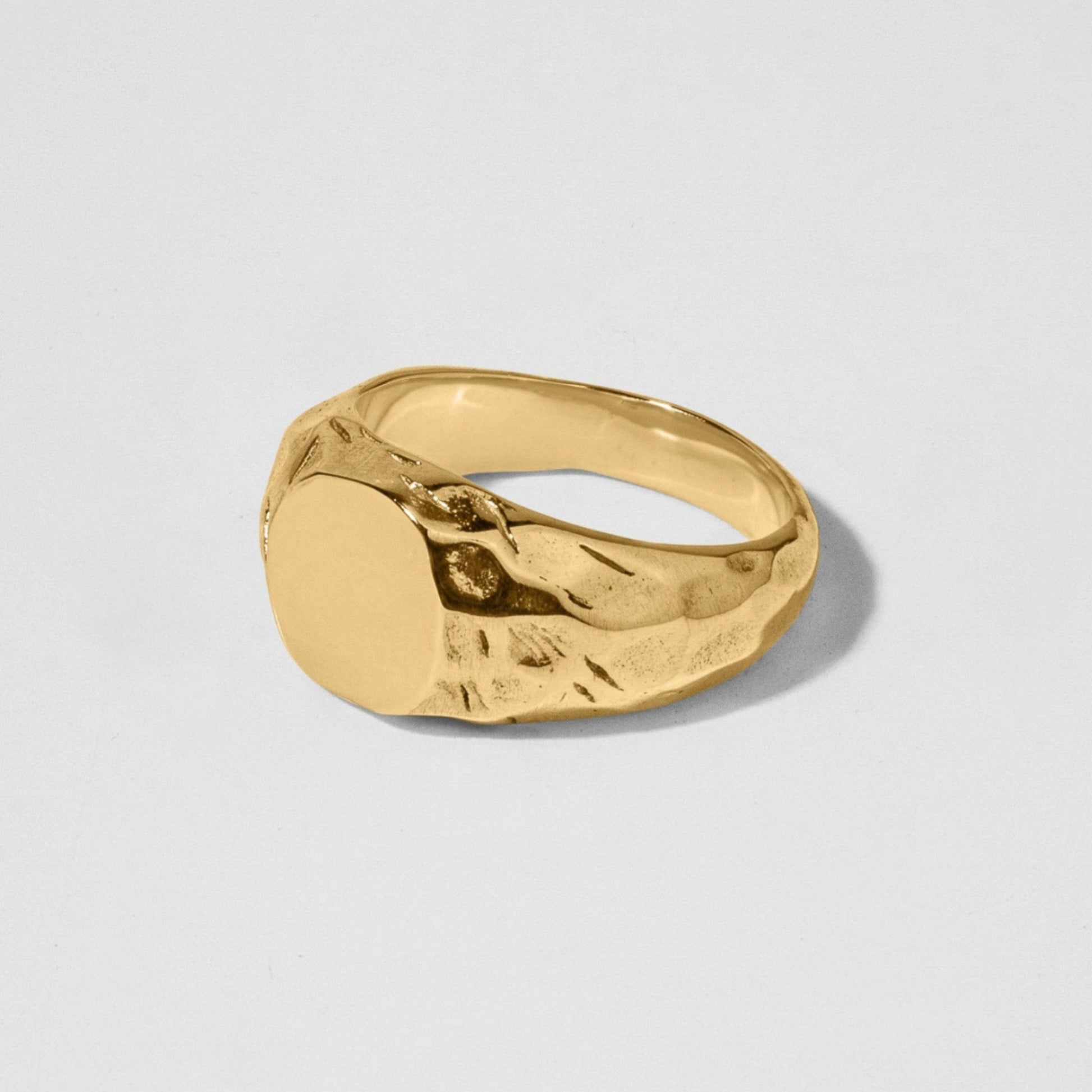 RAWNINETY’s signature Jasper 1.0, now in gold. Hand-etched detailing contrasts with a polished circular face, creating a refined finish with a worn-in edge. Handcrafted from recycled 925 sterling silver and plated with 3.5 microns of gold, its textured surface and sculpted edges add depth, bringing bold character to this statement piece. Wear it solo or pair it with the Jasper Gold Cuff for a defined look.