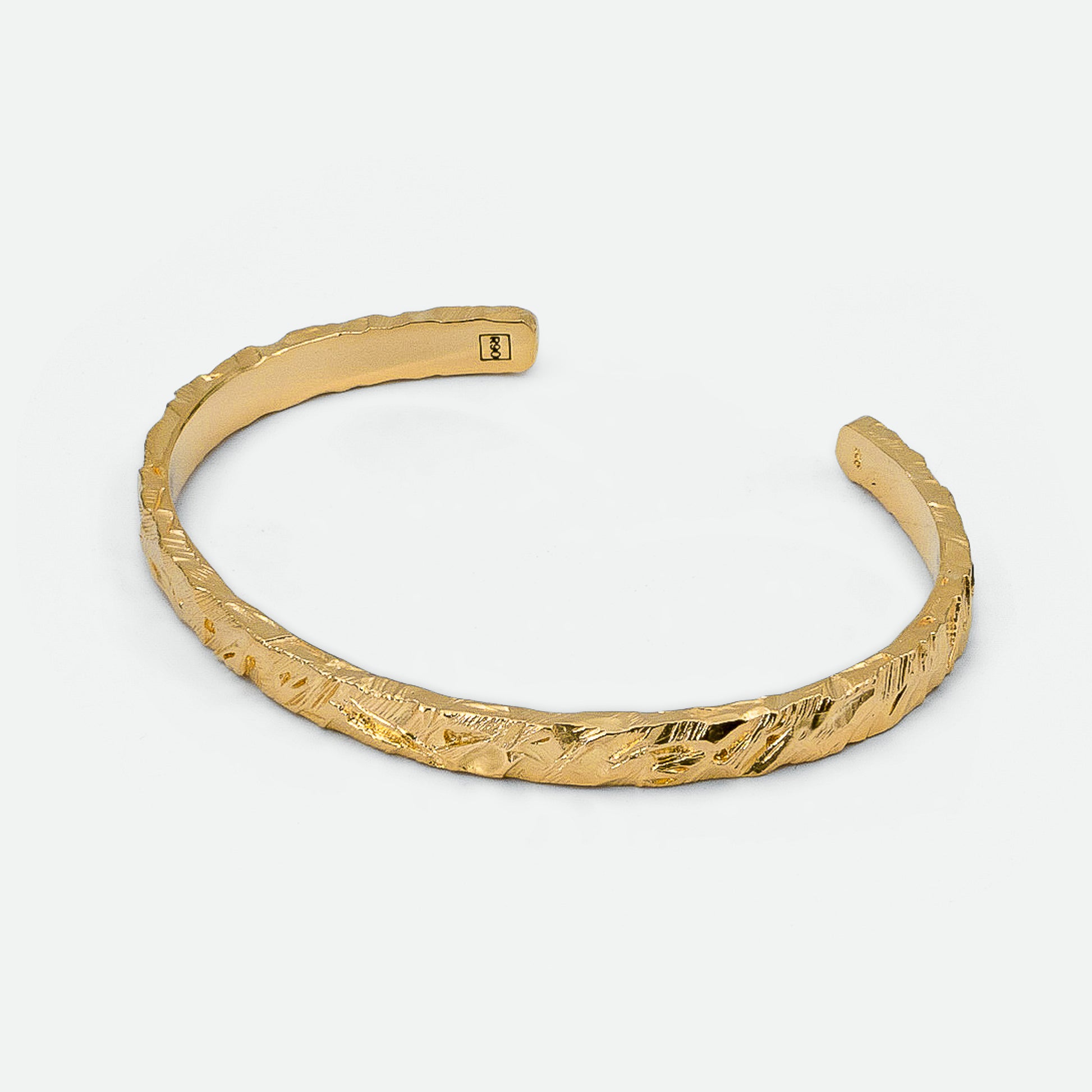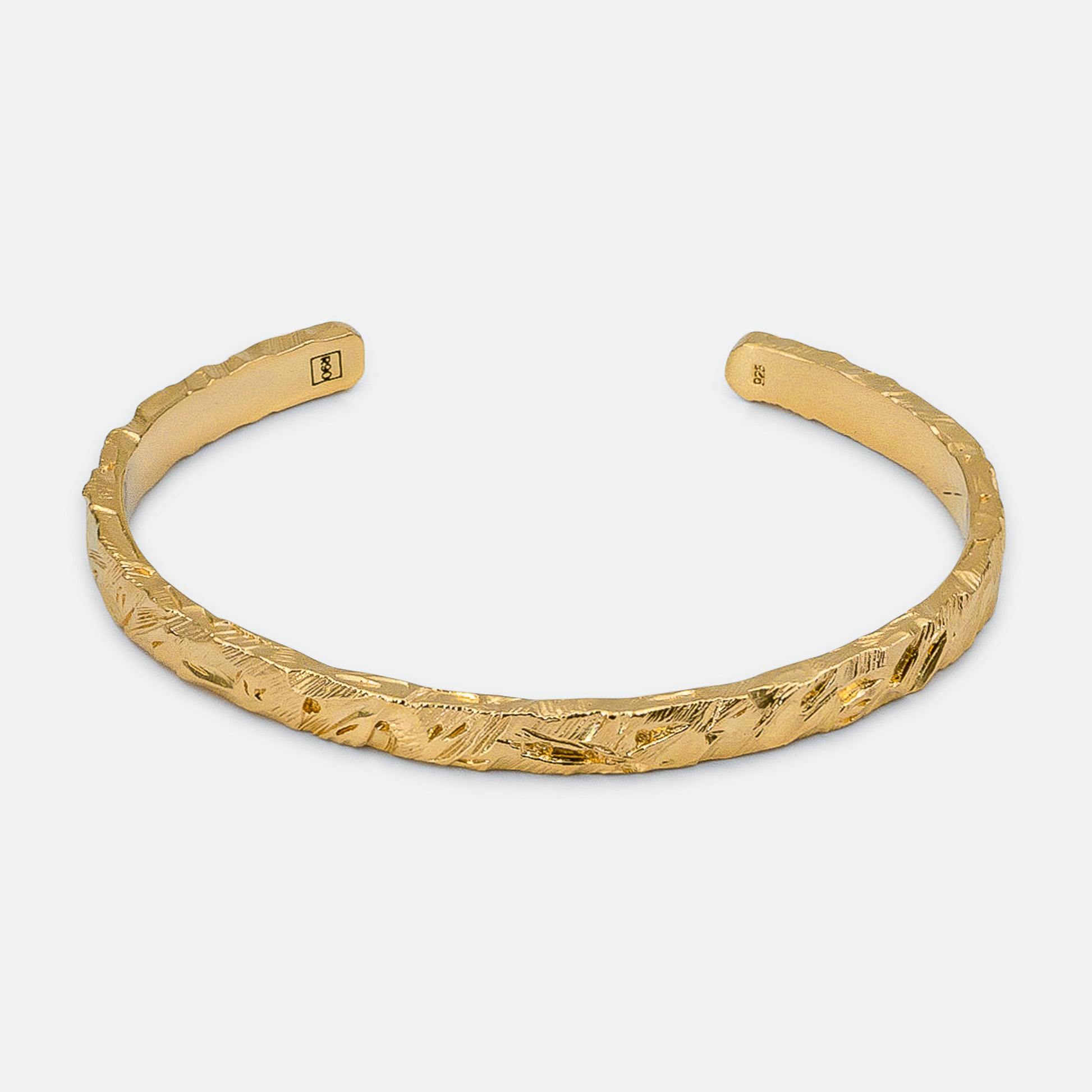The Jasper Gold Cuff is defined by its raw texture and refined design. Handcrafted from recycled 925 sterling silver and plated in 3.5 microns of gold, its hand-etched indentations create a bold contrast against the polished finish. The uneven detailing adds depth, making it a versatile staple from day to night. Wear it solo for a statement or style it with the Jasper Gold Band or Jasper 1.0 Signet Ring for a complete set.