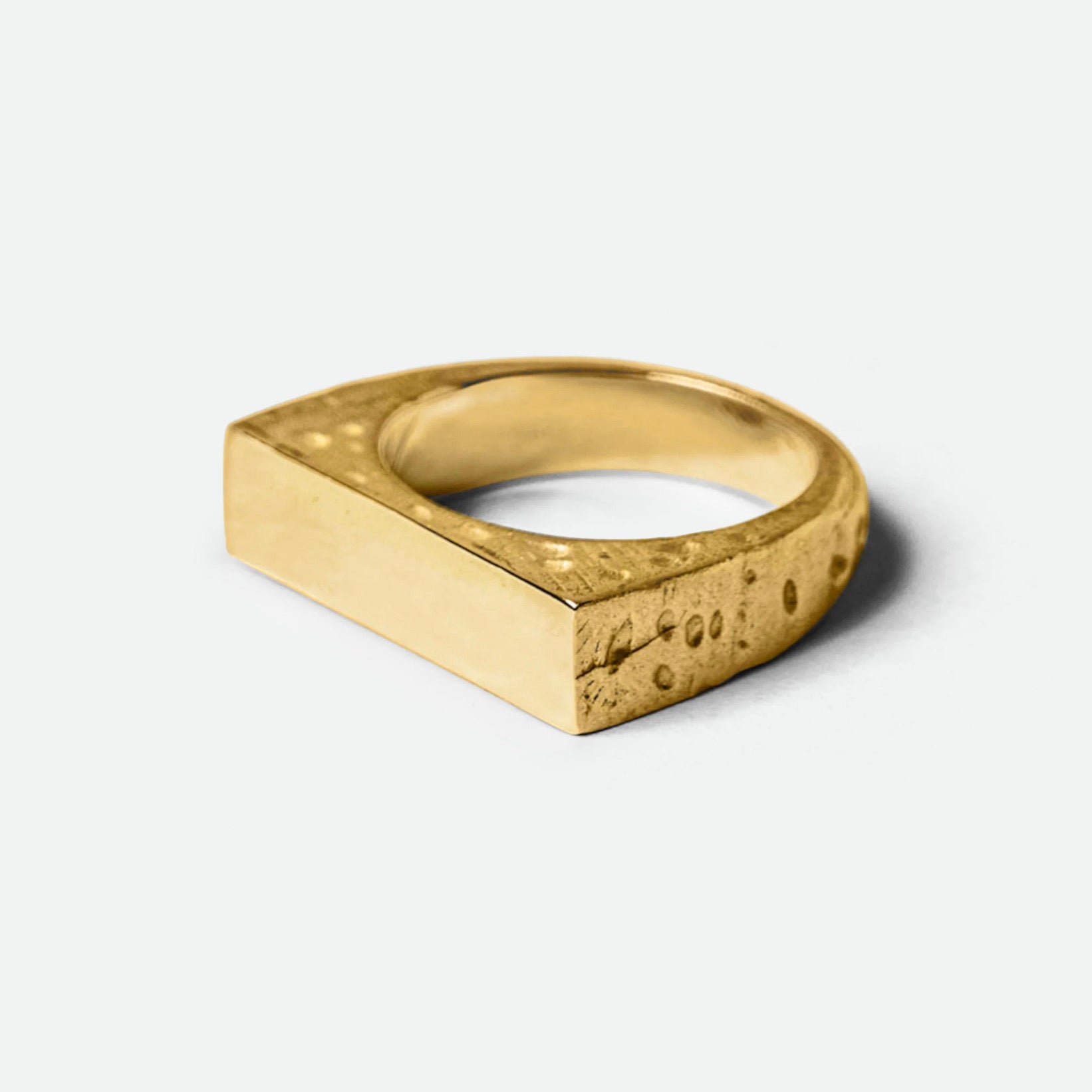 The Mickey 1.0 Signet Ring is defined by its bold structure and raw detailing. A polished rectangular face contrasts against a textured sandblast finish, balancing refinement with rugged appeal. Handcrafted from recycled 925 sterling silver and plated with 3.5 microns of gold, this piece is designed for versatility. Wear it alone or style it alongside RAWNINETY’s signature Mickey Gold Ring for a layered look.