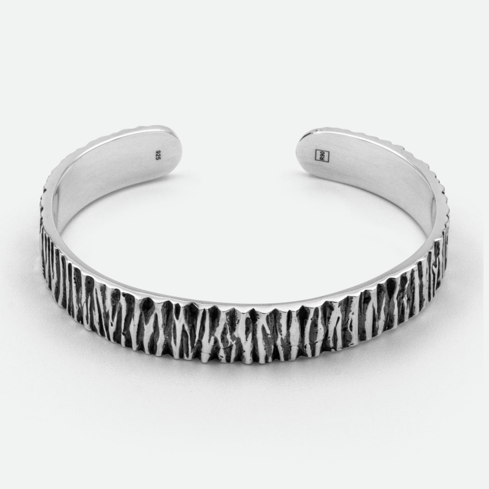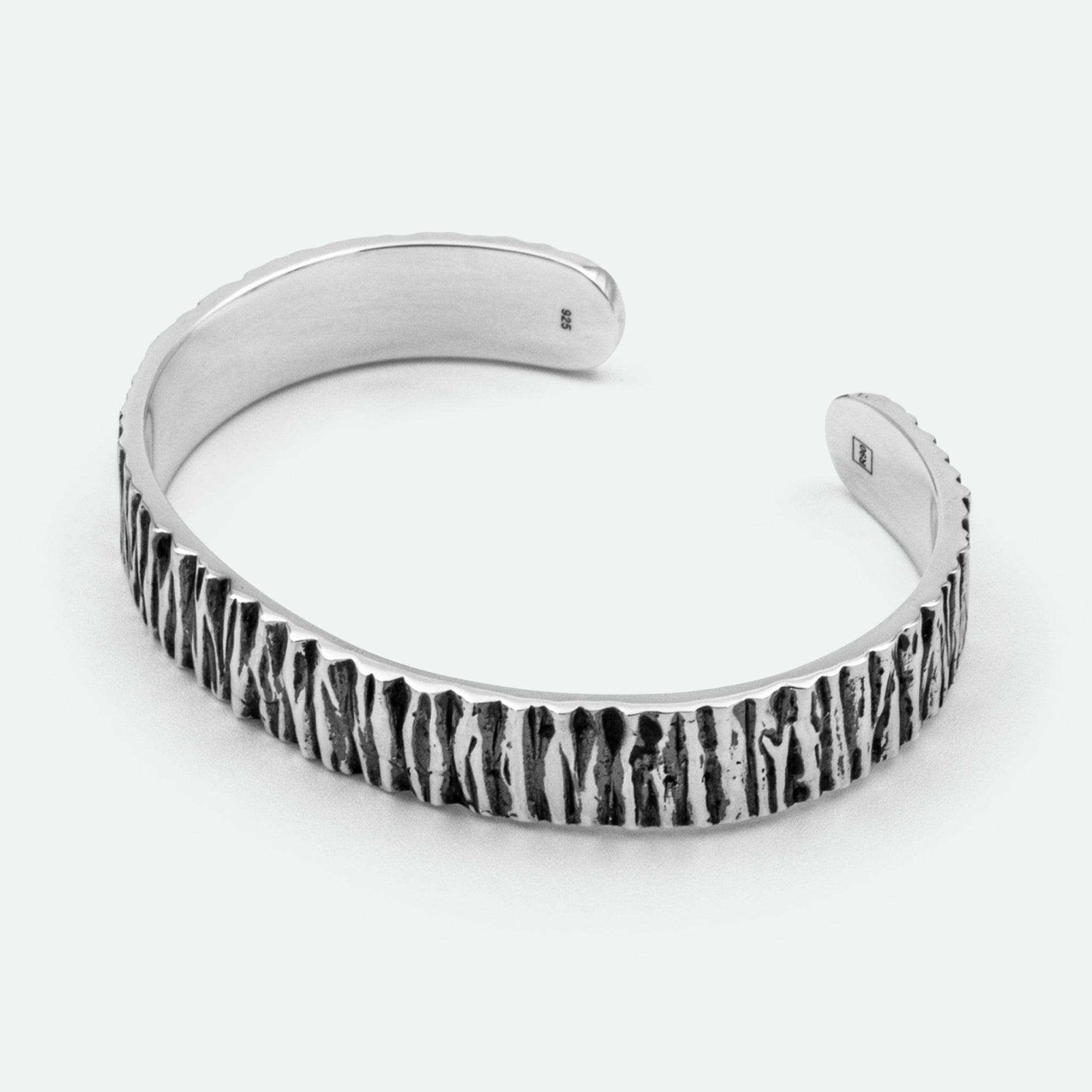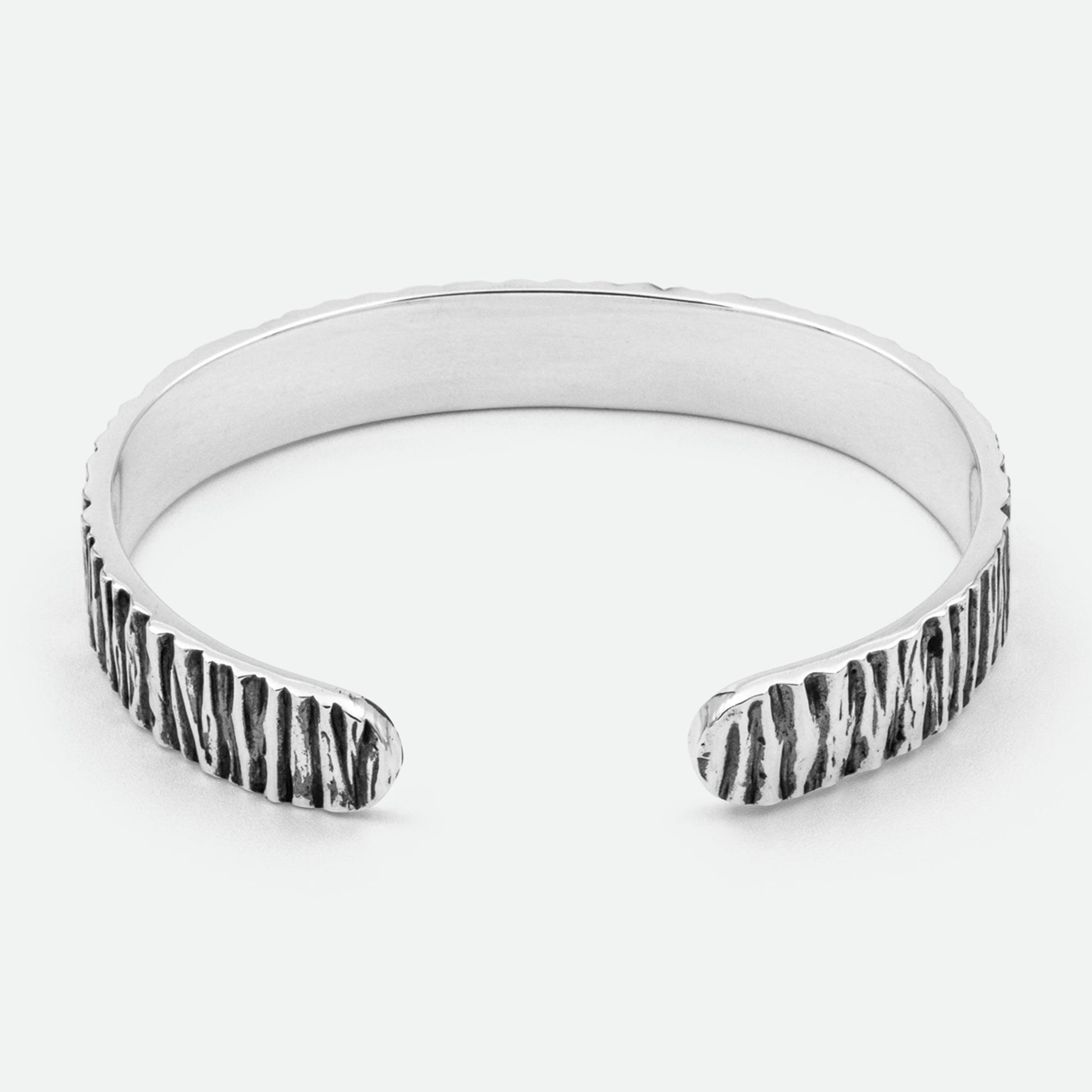 The ultimate gentlemen; refined around the edges with contrasting details to perfectly balance light and dark. This 12mm sterling silver cuff bracelet adds dimension and depth to any wrist, ideal for styling with the Otis ring for a complete set.