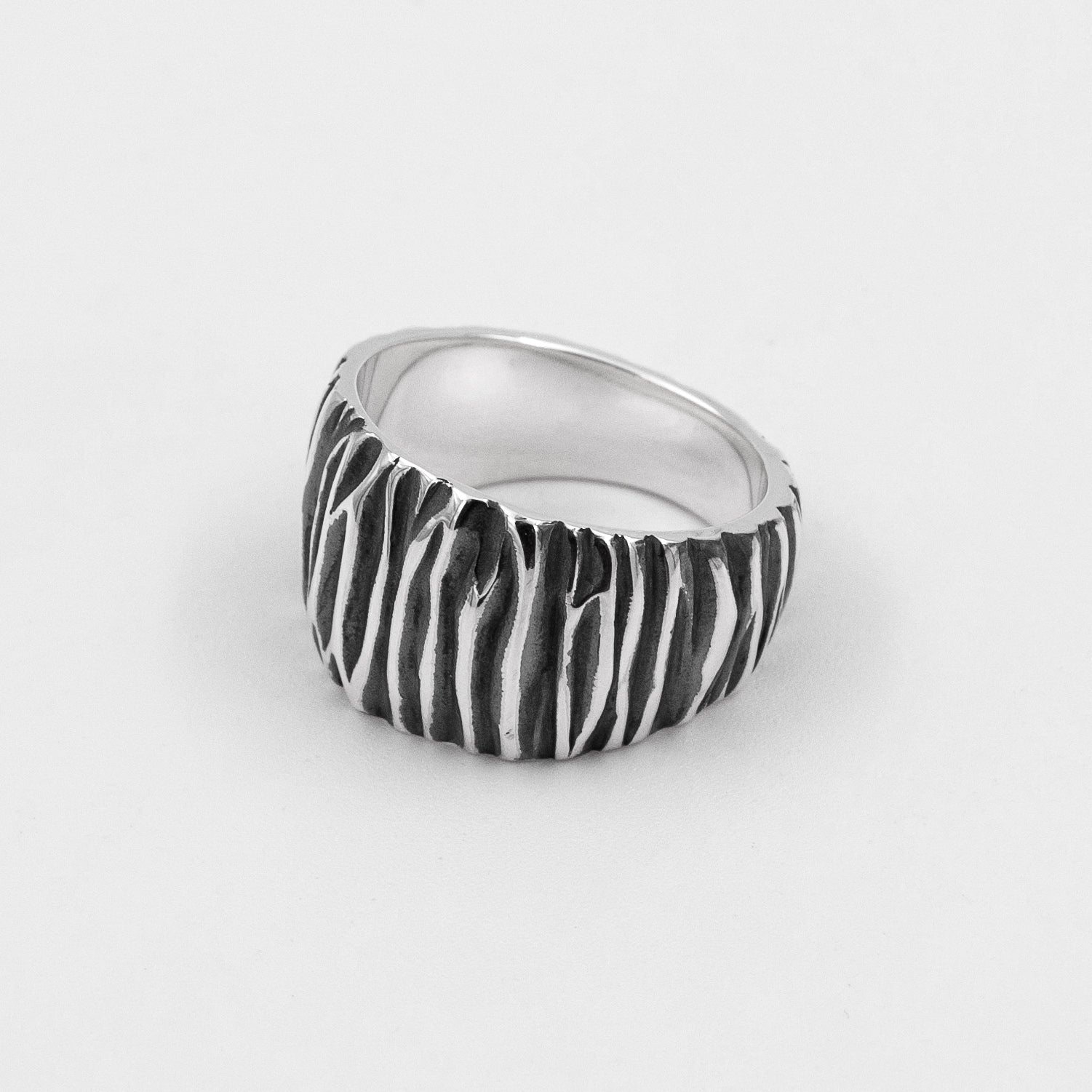 With signature oxidisation and polished edging, the Otis Ring has the visual appeal of a wide set band with a refined, smaller finish under the finger for comfortable all day wear. This unique design allows for wear on its own with the Otis Cuff, or with contrasting R90 band widths for a stacked effect.