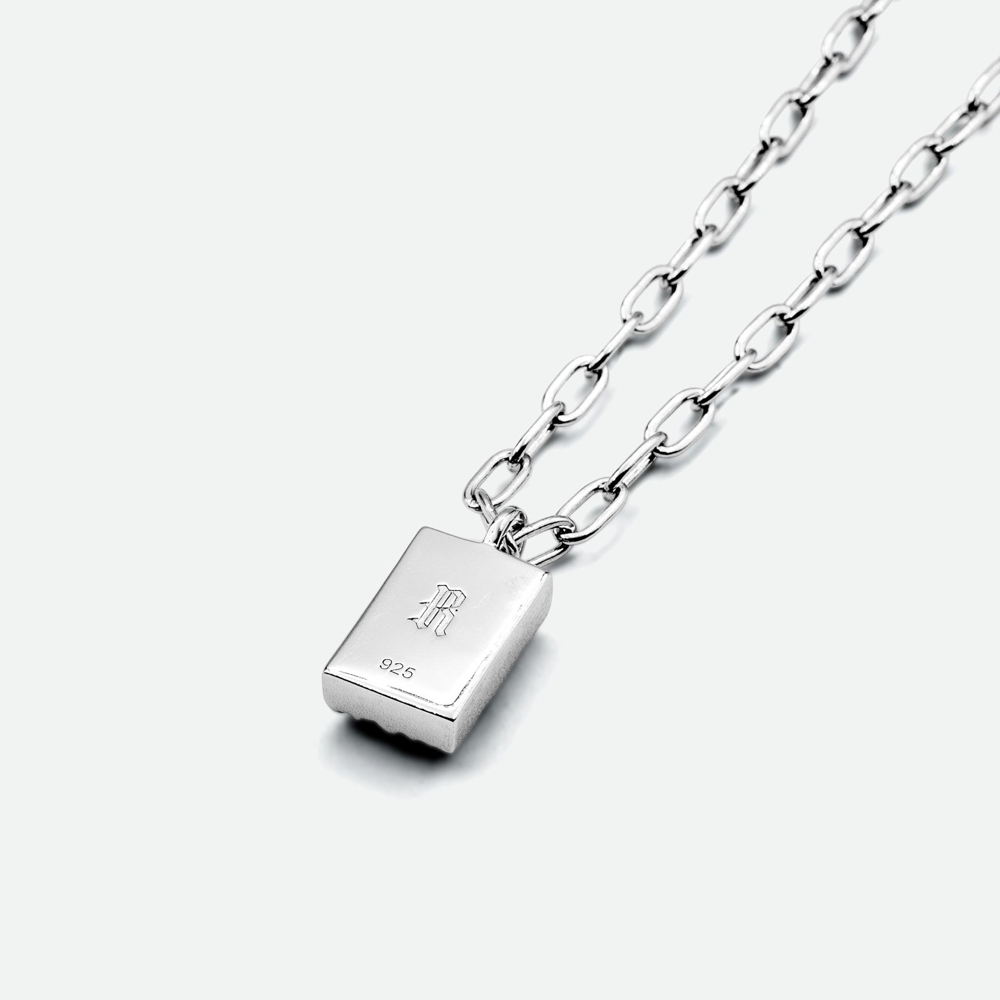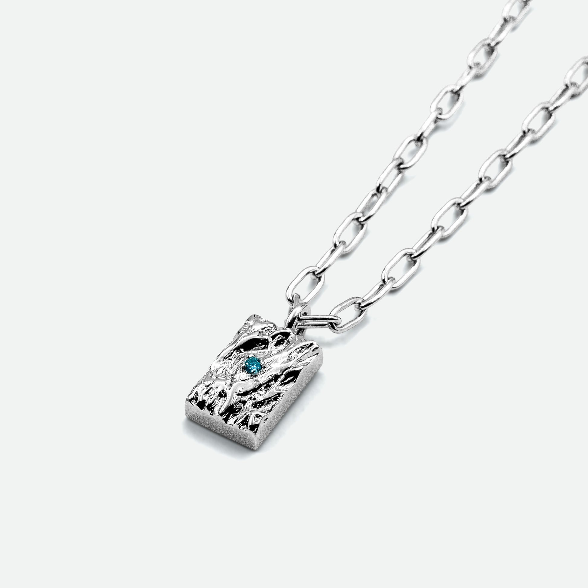 The Rayne Pendant Necklace features bold texture and refined design, crafted from rugged, high-polished platinum-plated silver. At its center, a striking aqua blue topaz stone catches the light, adding depth and character. Suspended on a versatile 52cm chain, this piece balances raw elegance with uncompromising style, making it a distinctive addition to any collection.