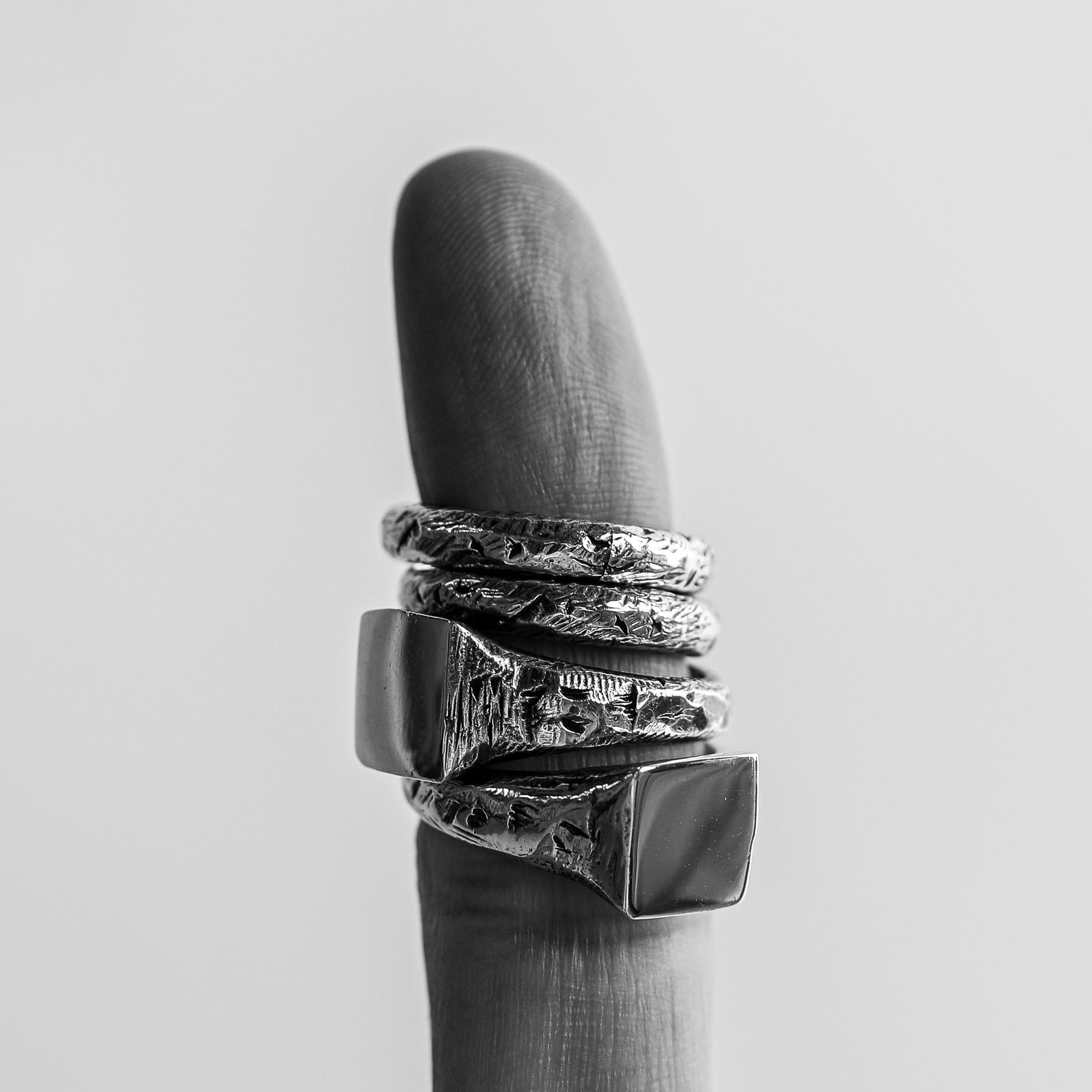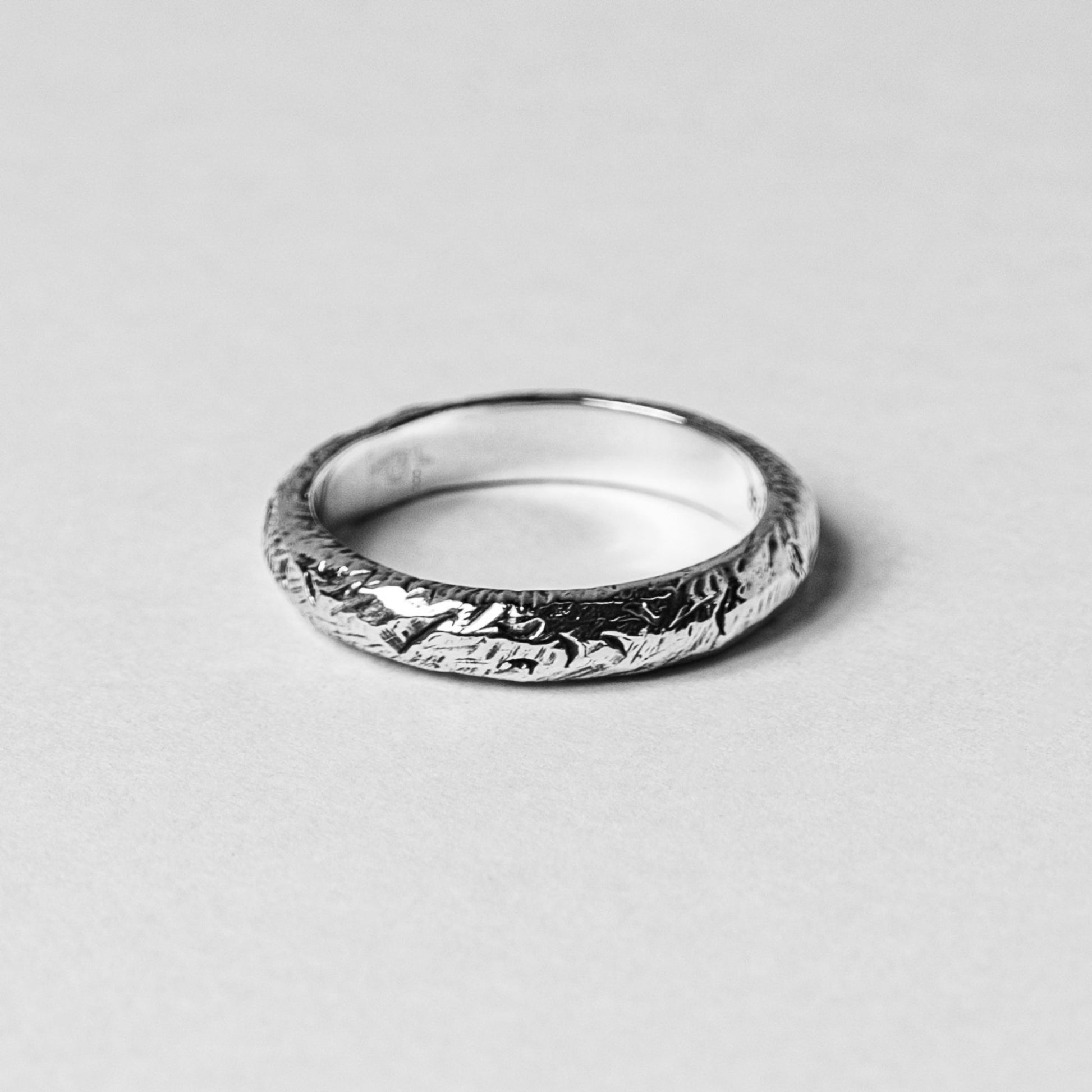 Like the smallest member of any gang, The Stenson balances size with style through hand engraved textures and a unique oxidised finish. Uncomplicated and traditional in shape, The Stenson imbues strength and integrity with a subtle nod to silversmiths’ past.