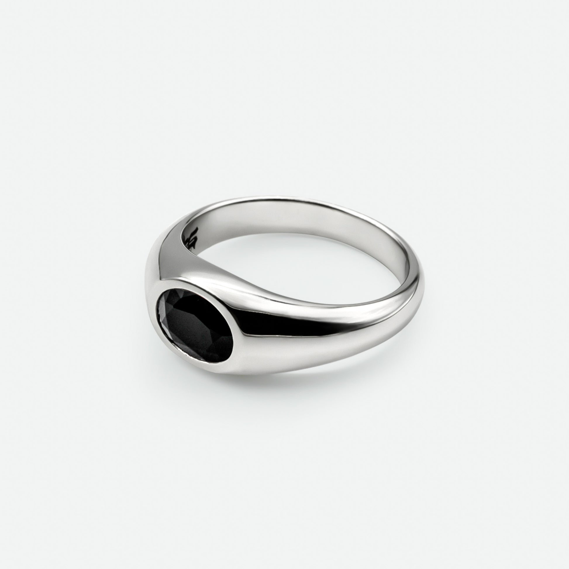 The Yuki Black Onyx Signet Ring combines classic design with modern style. Crafted from recycled 925 sterling silver and finished with a high-polish rhodium plating for lasting durability, it features a bold rose-cut black onyx stone at its centre, adding depth and character.